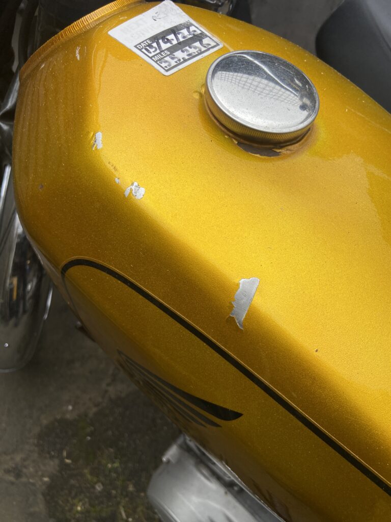 She was parked outside in the yard at work and the wind blew a length of angle iron onto the fuel tank. The tank is painted with candy gold so it’s pretty much impossible to colour match a touch up. I’ve ordered a new black tank to match the side panels.